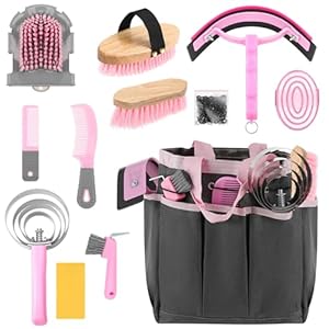Abbylike 12 Pieces Horse Grooming Kit with Organizer Tote Bag Tack Room Supplies Horse Brush Sets Equine Care Cleaning Kit Shedding Grooming Massaging Tools(Pink and Grey)