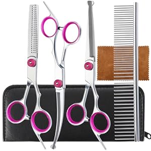 5 in 1 Premium Dog Grooming Scissors, Professional Dog Scissors for Grooming with Safety Round Tips, Lengnoyp Stainless Steel Thinning Shears, Pet Cat Shears for Grooming Kit, Pink
