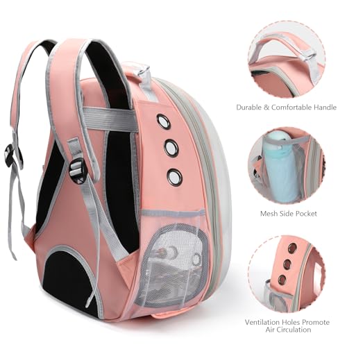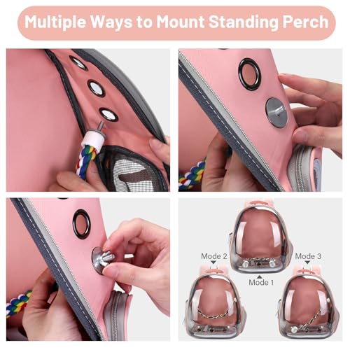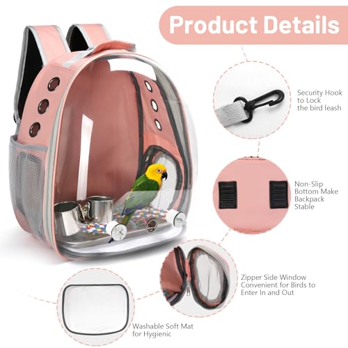Bird Backpack Carrier, Travel Bird Cage for Small Medium Size Parrot Parakeet Budgies Cockatiel, Portable Clear Bubble Window Bag with Stainless Steel Tray Food Bolw Standing Perch (Pink)