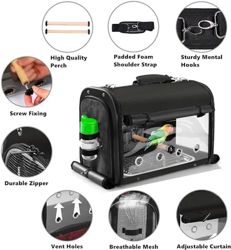 【FEEDING & PERCHING】There are removable bowls, a water bottle and two perches come with the bird carrier. It provides a comprehensive care and comfortable environment for birds.