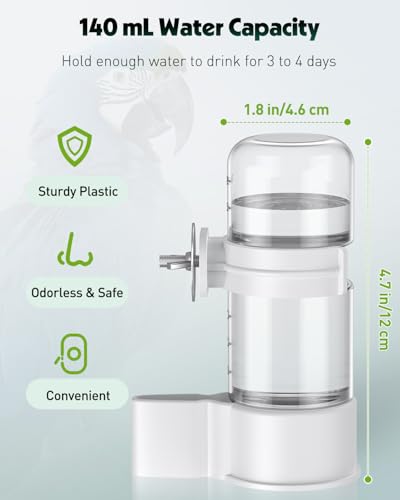 140 mL Water Capacity: The bird water dispenser measures 4.7″ (height) x 1.8″ (diameter), holding enough water to drink for 3 to 4 days. Sufficient capacity to satisfy your bird’s drinking water needs. Never worry about your bird getting thirsty again