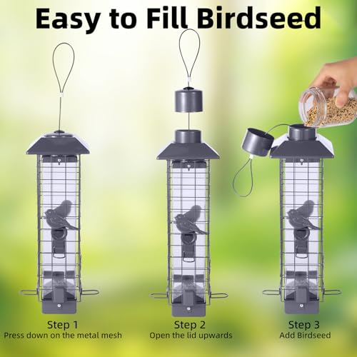 Easy to Use: Bird Feeder can holds up to 3 lbs seeds, the top cylinder can be opened upwards, the opening that is easy to fill with food and clean