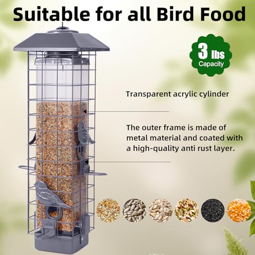 Squirrel Proof Bird Feeders for Outdoors: Bird feeder has a built-in weight activated spring, after the squirrel climbs up, the feeding port will close