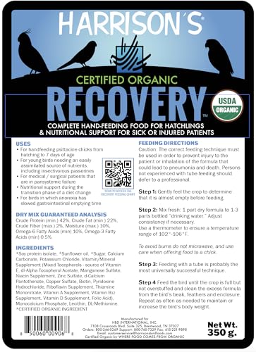 OPTIMAL RECOVERY FORMULA. Harrison’s Organic Recovery Hand-Feeding Formula is specially formulated as a recovery food for birds needing an easily assimilated source of nutrients.