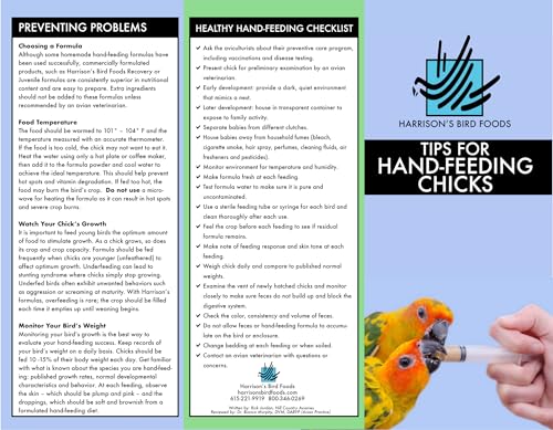 HAND-FEEDING FOR HATCHLINGS. An excellent hand feeding formula for birds for hatching for the first few days of life. When chicks are 4 days old transition to Harrison’s Bird Foods Juvenile hand feeding formula for maximum nutritional support through weaning.