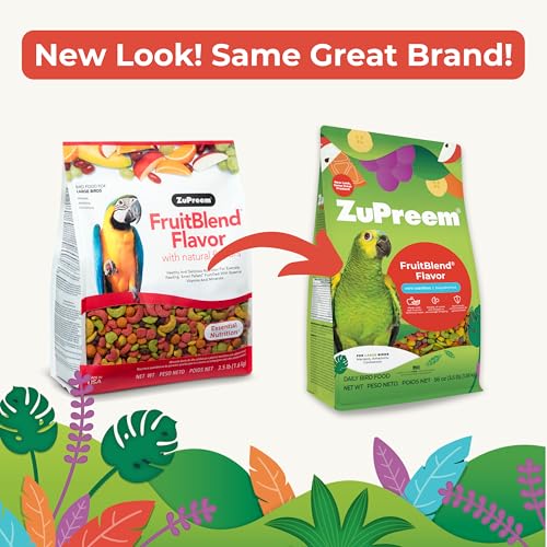 Give your large feathered friend a fun, flavorful, and balanced diet with ZuPreem FruitBlend for Parrots & Conures. Specially designed for Macaws, Amazons, Cockatoos, and other large pet birds, this premium bird food features colorful, fruit-shaped pellets packed with essential vitamins, minerals, and antioxidants to support strong immunity, healthy digestion, brain function, vibrant feathers, and beak strength. The variety of shapes, colors, and fruit flavors encourages foraging instincts and natural eating behaviors, making mealtime exciting, nutritious, and engaging. Formulated as a complete and balanced daily diet, FruitBlend bird food is the perfect main meal and pairs beautifully with your bird’s favorite fresh foods, nuts, seeds, and foraging treats. Recommended by avian veterinarians and trusted by bird owners, this high-quality bird food helps large parrots stay active, healthy, and full of energy. Whether you’re feeding a Macaw, Amazon, or Cockatoo, give them the best nutrition for a happy and thriving life!
