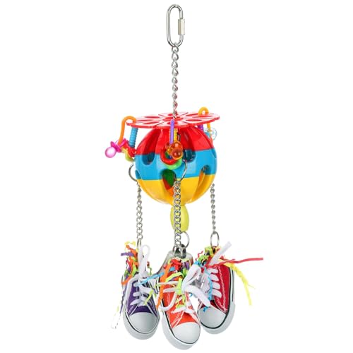 VIBRANT COLORS FOR VISUAL STIMULATION: Dive into a world of vibrant colors with the Kick Ball Toy! It showcases four grommet-free sneakers dangling from a plastic birdie ball on nickel-plated chain, capturing your bird’s visual attention and creating an attractive play environment. The ball is also adorned with wiggle rings, pacifier beads and a bell. The lively hues and textures add a playful touch to your bird’s habitat, ensuring an enticing playtime experience.