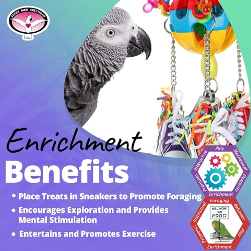 STIMULATING & ENTERTAINING: The Kick Ball bird toy ensures an abundance of sporting excitement for your energetic feathered friend. Enhance the experience by hiding treats in the canvas sneaker, transforming it into a foraging toy. This engaging toy not only entertains but also stimulates your bird’s senses and natural foraging behavior, making it an irresistible addition to their playtime routine.