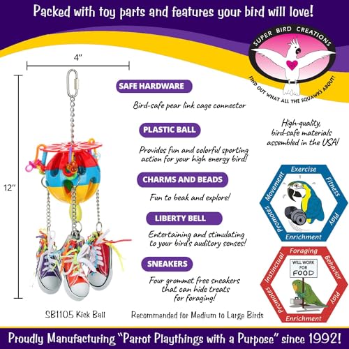 IDEAL FOR MEDIUM BIRDS: Designed specifically for medium birds like Ringnecks, Conures, Quakers, Caiques, Pionus, Senegals, Amazons, African Greys, Eclectus, Small Cockatoos, Mini Macaws and similarly sized pet birds, the Super Bird Creations Kick Ball Bird Toy offers engaging entertainment and physical exercise, reducing cage stress and boredom. It also attaches to the cage with a bird-safe pear link.