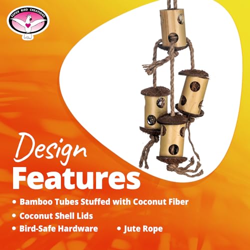 INTERACTIVE BIRD TOY DESIGN: The Bamboo Climb & Forage Bird Toy features bamboo tubes stuffed with coconut fiber, coconut shell lids & jute rope design that is perfect for foraging fun by hiding treats in the bamboo tubes. This encourages natural behaviors and keeps your bird mentally sharp and active.