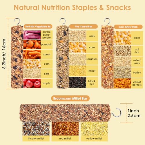 PERFECT FOR ALL BIRDS: Conure chew treats mixed from cereals, vegetables and fruits, are suitable for kinds of bird species, like canary, budgie, parakeet, conure, lovebird, cockatiel, amazons, african grey, finches and more parrots. Besides, cereal treat is also a favorite food for hamster, chinchilla and more rodent pets