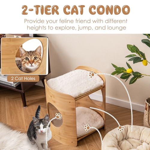 Tangkula Elevated Cat Bed for Indoor Cats, 2-Tier Cute Small Cat Tree Tower with Natural Bamboo Frame, Removable & Washable Soft Plush Mats, Cat Holes, Farmhouse Pet Furniture