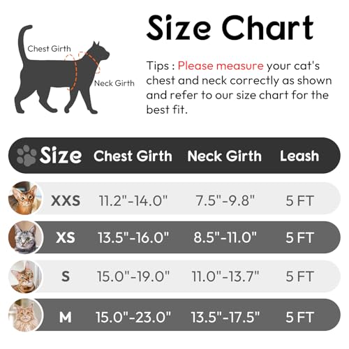 Size Reference – Please measure your cat and refer to the size chart first before ordering! If your cat is between sizes, please choose the smaller size.XS (Neck Girth: 8.5” -11”, Chest Girth: 13.5” – 16”), S (Neck Girth: 11” – 13.7”, Chest Girth: 18” – 20”)