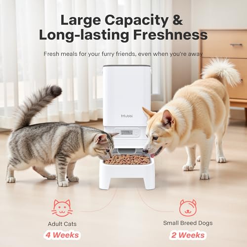 𝗟𝗮𝗿𝗴𝗲 𝗖𝗮𝗽𝗮𝗰𝗶𝘁𝘆, 𝗖𝗿𝗶𝘀𝗽𝘆 𝗙𝗿𝗲𝘀𝗵𝗻𝗲𝘀𝘀: The Mubbi automatic cat feeder has a large capacity and a desiccant bag, providing 28 days of fresh food for cats or 7-14 days for medium-to-small dogs. There’s no need to open the lid frequently for refills, preventing moisture intrusion. It’s ideal for multi-pet households and owners away for extended periods. Please replace the desiccant bag (L ≤ 3.3″, W ≤ 1.7″) monthly