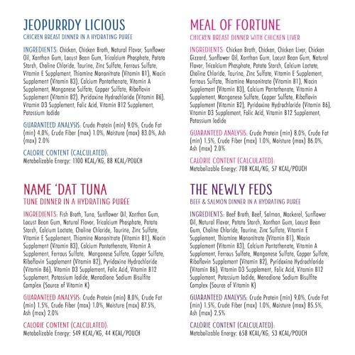 Variety Pack includes 2 pouches of each: The Newly Feds, Jeopurrdy Licious, Love Connection, Let’s Make a Meal, Meal of Fortune, Name ‘Dat Tuna, The Slice is Right, Family Food