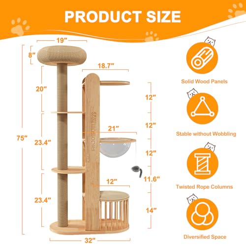 【UNIQUE HIGH-END DESIGN】This 75 inch high cat tree takes your cat-loving life to a new level! This tall cat tower has a spacious resting space on the top, a hollow cat house at the bottom, and sisal scratching posts, providing rest and entertainment for kittens, adult cats and large cats.