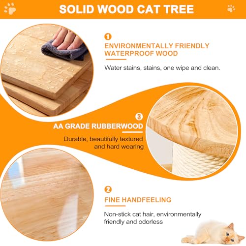 【SUPERIOR QUALITY】This cat furniture is made of natural solid wood to ensure stability and durability. The oversized double-layer rubber wood base ensures stability and safety for cats when playing, climbing, and resting. The polished surface is waterproof, hair-free and easy to clean