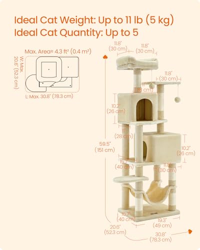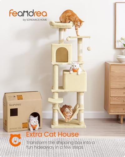 Feandrea Cat Tree, 59.5-Inch Tall Cat Tower, Plush Multi-Level Condo with 5 Scratching Posts, 2 Perches, 2 Caves, Hammock, 2 Pompoms, Beige UPCT192M01