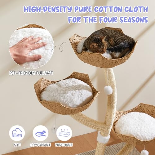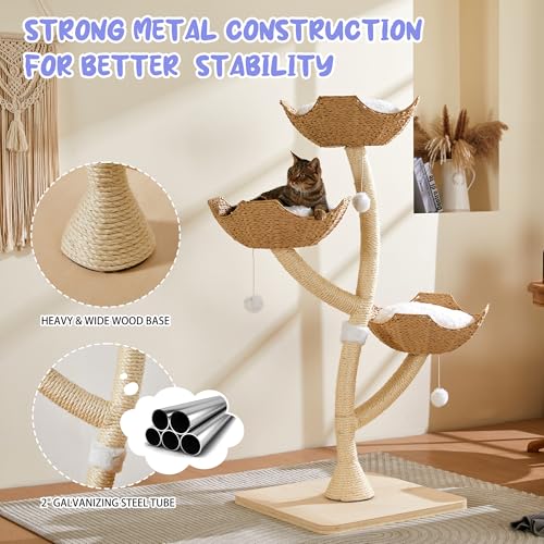 UPGRADED WOOD MATERIAL. The bottom of the cat bed has been upgraded to a thicker and more sturdy material, ensuring its long-lasting durability. Made out of quality materials: a solid 23″ wooden base, 2″ diameter galvanized pipe and strong natural sisal. The natural cat friendly material provides a good environment for your cats to run and jump. It also comes with 3 hand-woven rattan baskets and 3 comfortable breathable cushions for nap. This beautiful modern cat furniture allows multiple cats to play and rest at the same time!