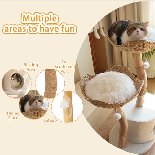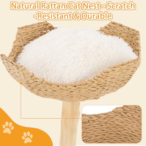 🧶Sisal-Wrapped Scratching Post & Handwoven Rattan Nest The trunk of the cat tree is wrapped in natural sisal rope, offering a perfect spot for your cat to scratch freely. The cozy nests are handwoven from virgin pulp paper, creating a natural rattan texture that not only serves as a comfortable resting place but also emits a gentle, earthy scent. (Cat tip: Felines love the scent of nature—bring them a leaf from outside and watch them light up with joy!)
