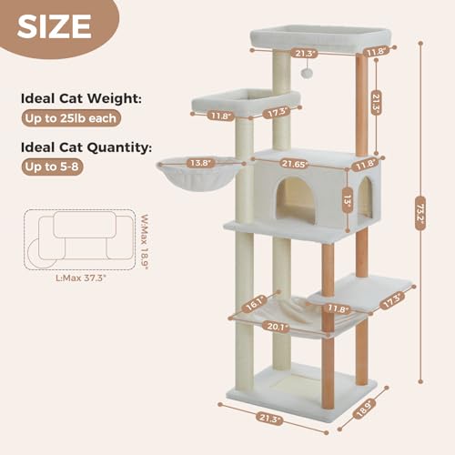 PAWZ Road Large Cat Tree, 73 Inches Tall Wooden Cat Tower with 2 Spacious Hammocks,2 Big Top Beds,8 Fully Scratching Posts and Natural Wood Posts, Multi Cat Tree for Indoor Cats Large Adult-XL