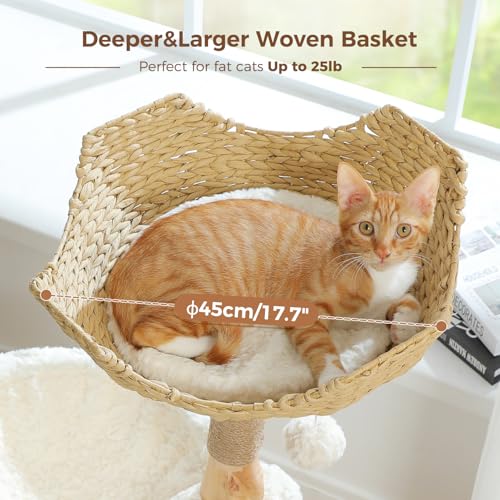 Large Woven Wicker Basket: Unlike typical plush perches, this cat tree includes a deep and enlarged basket bed made of hand-woven rattan. It is well-shaped and breathable, perfect for larger cats to sleep comfortably in the sunshine. A soft plush mat is included for added comfort, and the high edges create a sense of safety and coziness.