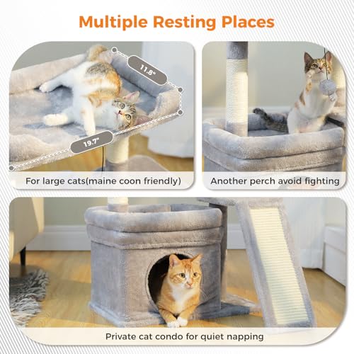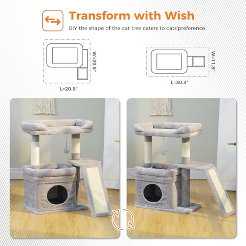 PEQULTI Small Cat Tree Tower for Large Adult Cats with Wide Top Perch, Private Cat Condo and Sisal Scratching Post&Pad for Indoor Cats, Gray