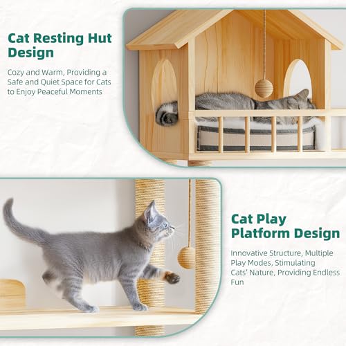 Wood Cat Tower for Automatic Litter Box, 60.2″ H Tall Cat Tree for Self Cleaning Litter Box, Multi-Level Solid Wood Cat Tree Tower Cat Furniture w/Scratching Post, House, Burlywood