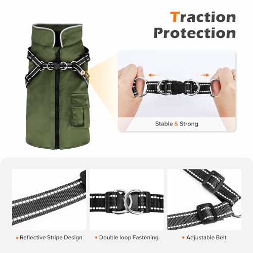 Built-in Harness & Reflective Safety:More than just a dog jacket, this vest features a built-in harness with durable leash attachment points, eliminating the need for a separate harness. Enhanced with reflective strips, this dog winter jacket ensures your pet’s visibility and safety during early morning or nighttime walks.