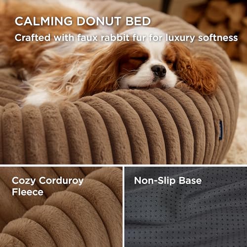 Bedsure Donut Medium Dog Bed – Washable Faux Fur with Corduroy Fleece & Anti Slip Bottom, Round Pet Bed with Removable Cover, Camel Brown, 30x30x8 inches