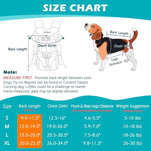 Recommended for Small Medium Dogs: This pet carrier backpack is designed for carrying small dogs and puppies, S is for dogs weighing less than 10 Pounds, M for dogs less than 18 Pounds, L for < 26 Pounds, XL for < 30 Pounds. Please MEASURE before buying, choose accordingly from our size chart, prioritizing BACK LENGTH when between sizes. DO NOT choose size based on dog breeds or dog's usual size