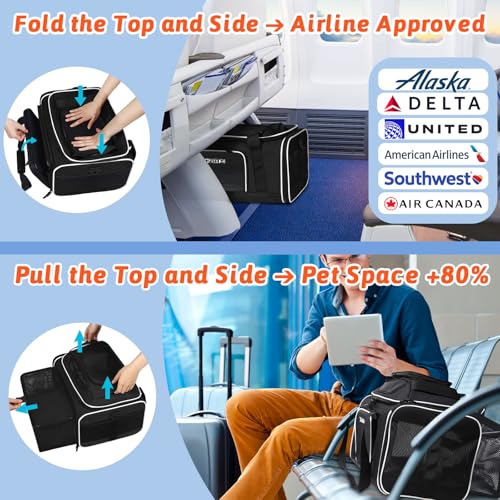 Petskd Top and Side Expandable Pet Carrier 17x11x9.5 Inches Alaska Airline Approved, Soft-Sided Carrier for Small Cats and Dogs with Locking Safety Zippers and Anti-Scratch Mesh(Black)