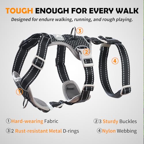 Huntboo Escape Proof Dog Harness – No Pull, No Slip, Fully Reflective, Adjustable 7-Point Design for Small, Medium, and Large Dogs – Lightweight for Outdoor Training & Hiking (Black, M)