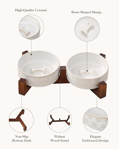 🦴【ELEGANT DESIGN】Featuring embossed Five-leaf Grass and Honeycomb patterns, paired with a stylish walnut wood stand for elevated dining. These ceramic dog bowls combines classic and modern styles to enhance its visual appeal. The cleverly designed dog bone-shaped decoration at the bottom adds both beauty and fun.