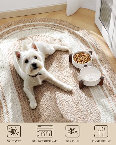 🦴【STABLE SETUP】Raised wooden stand keeps bowls securely in place, helps prevent spills, and provides a comfortable feeding height. Made from durable PSC clay, each bowl is thicker and heavier, reducing the chance of tipping during meals. Includes non-slip adhesive pads that stick firmly to the bottom of the stand, further ensures stability and keeps it from sliding around.