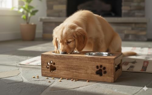 Paw Design Wooden Pet Feeder Station Stand with 2 Stainless Steel Bowls | Raised Dog Bowl Elevated Cat & Puppy Dining Table | 16 x 8.5 x 5 Inches