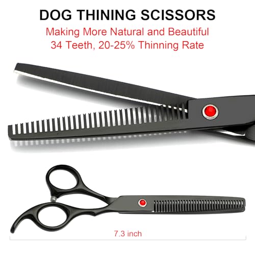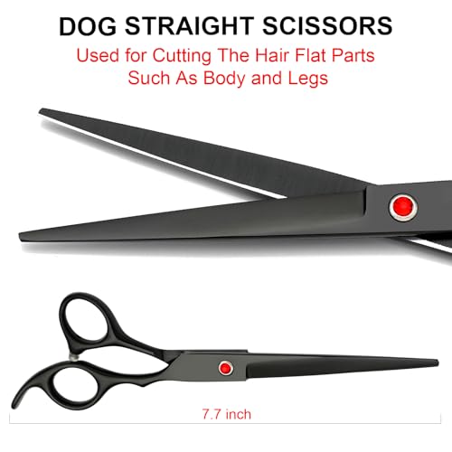 Professional Dog Scissors Kit : Dog scissors kit includes dog thinning shear * 1, dog curved scissors * 1, dog straight scissors * 1, grooming comb * 1, cleaning cloth * 1, and black leather case * 1, suitable for home use and professional groomers
