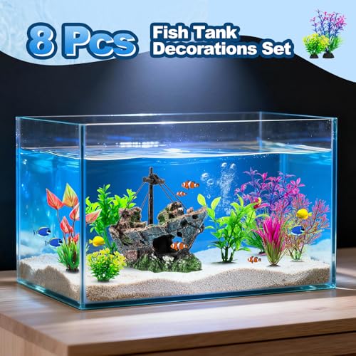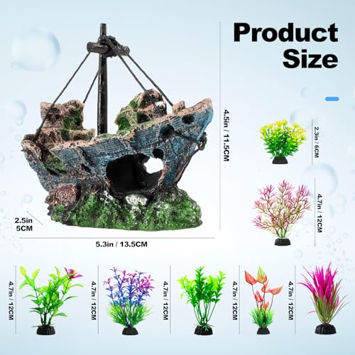 8Pcs Fish Tank Decorations Set: The sunken ship measures 5.3 x 2.5 x 4.5 inches, paired with simulated aquatic plants ranging in height from 2.3 to 4.7 inches. The proportions are coordinated and the layout is flexible, making it easy to adapt to various small, medium, and large fish tanks, creating a three-dimensional underwater landscape with a strong sense of hierarchy