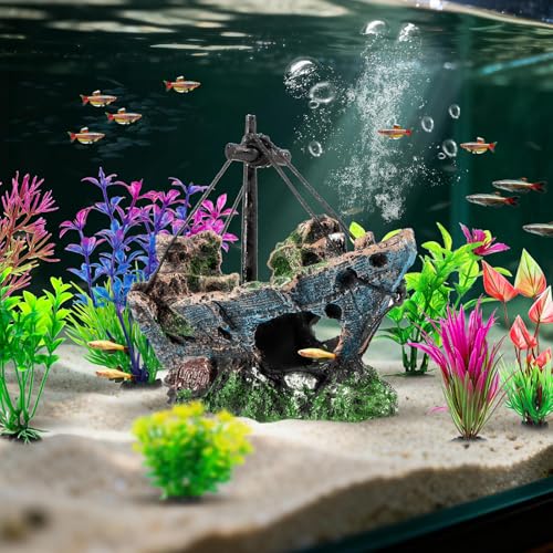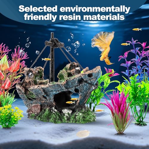 8Pcs Fish Tank Decorations Set Sunken Ship Decoration,Resin Material Fish Tank Accessories Accessories for Natural Look, Aquarium Shipwreck x 1pc, Aquatic Plants x 7pcs