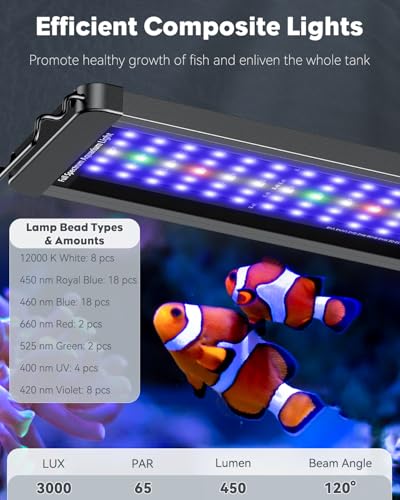 Full Spectrum: Feature 450 nm royal blue light, 460 nm blue light, 400nm UV, 420nm blue, 500nm green, 660nm red, 12000 K white light, etc. LUX: 3000; PAR: 65; Lumen: 450. Vivid composite lights greatly promote the photosynthesis of coral and growth of marine fish. Effectively enliven the whole tank