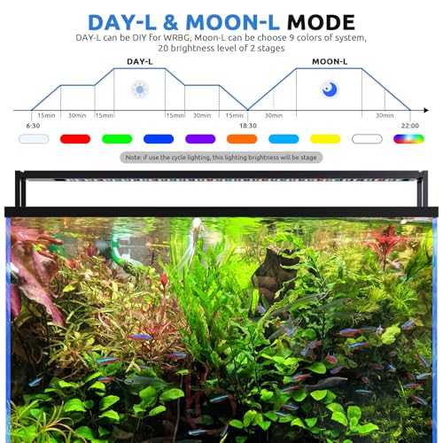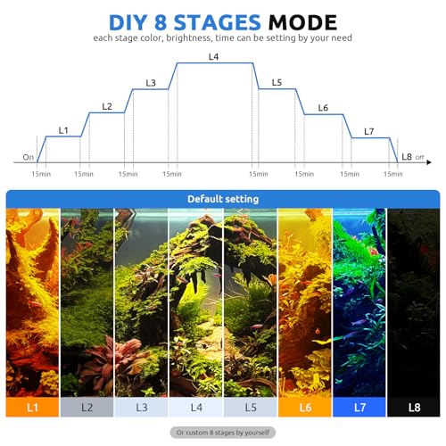 3 Customizable Modes – DIY (8 programmable segments), Day/Night (20-level WRGB dimming), and Preset Cycle (sunrise/daylight/sunset/moonlight) for perfect aquarium lighting