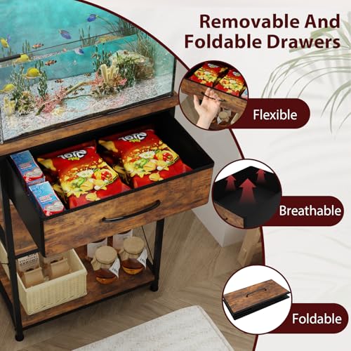 EFFICIENT AND ORGANIZED STORAGE: This 10 gallon aquarium rack features spacious storage drawer for neat and organized storage of your fish food, tools, and accessories. The cleverly foldable design offers great flexibility for your space, allowing you to easily keep things tidy and organized while maximizing usability.