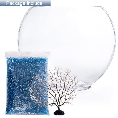 Okllen Mini Glass Fish Bowl, Oblate Small Fish Tank with Blue Aquarium Decor Sands and Plastic Coral Branch Tree Ornament for Betta Fish Aquarium, 1Gallon