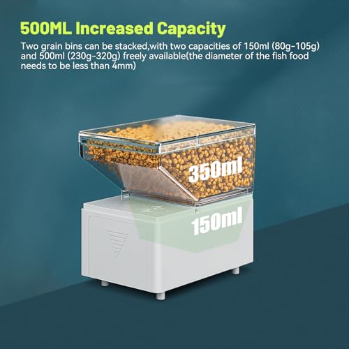 Expandable to 500ML Large Capacity: This 2025 upgraded version of the automatic fish feeder can add a grain container. The capacity can be increased from the basic version of 150ml (80g~105g) to 500ml (230g~320g),which can be flexible to meet your various needs.