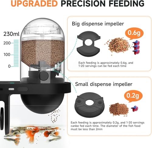 Taking into Account Both Small and Large Fish: There are two types of food outlets available for replacement. The small hole food outlet releases 0.2g of food each time, the large hole food outlet releases 0.6g each time. You can choose the right outlet according to the size and quantity of your fish. 0.06 Gallon (230ml) large-capacity feed bucket fish feeder automatic dispenser, suitable for a variety of fish feeds such as powdered, round and pillar. Note: It is not suitable for shrimp and flakes