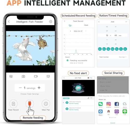 HD Camera Monitors Your Fish: Our automatic fish feeder is equipped with a 2k HD camera and uses a reusable nano-traceless adhesive that can be easily attached to the outer wall of glass and acrylic fish tanks. Open the APP, you can see the scene in the fish tank and monitor the feeding situation at any time. Take pictures, record videos, and share them on social media. This auto fish feeder is more interesting than ordinary feeders