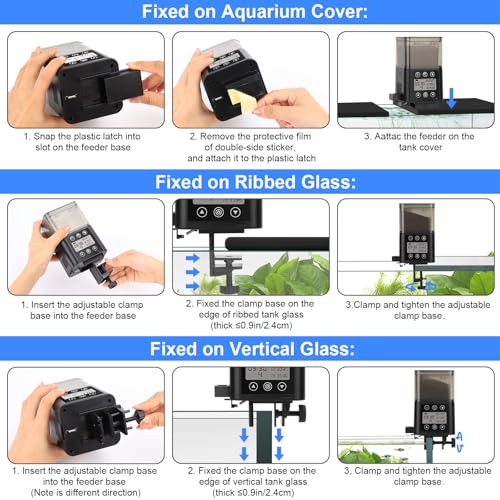 ✦- 3 SIZES PRECISE FEEDING, 3 FIXING METHODS -✦ This automatic food dispenser for fish tank has three different sizes of food dischargers, portion sizes can be adjusted to suit the different needs of fish/turtle/koi/goldfish/betta. Three Installation methods to fit any tank – clamp-on or freestanding placement.