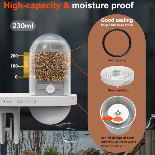 Moisture-Proof Design and 230ML Dry Storage: This automatic fish food feeder features a moisture-proof design and 230ML dry storage, keeping fish food fresh in both saltwater aquariums and freshwater tanks. Its large capacity ensures 7 days or more of consistent nourishment, making it ideal for weekend fish feeders and long-term aquatic care, even when you’re away.