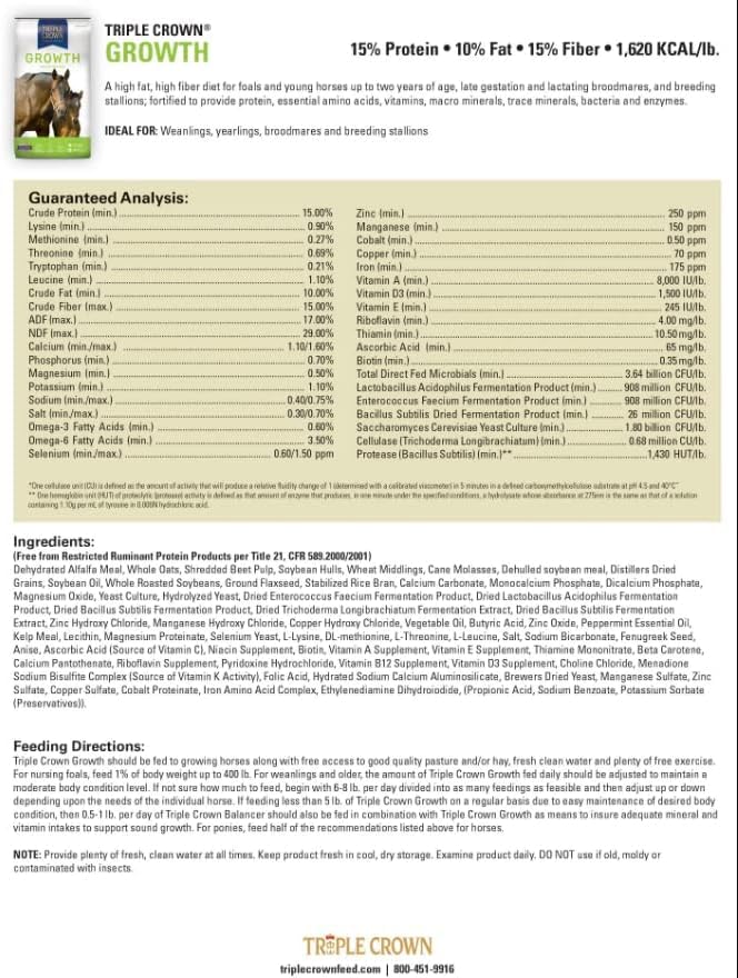 Triple Crown Growth Feed is the ultimate solution for those looking to ensure their young horses grow strong and healthy. This specialized feed is fortified with high-quality fiber sources like beet pulp, and high fat levels to provide young horses, broodmares, and breeding stallions with the calories they need without relying on high carbohydrates. It supports a consistent rate of growth, helping to alleviate joint problems often seen in growing horses. Whether dealing with hay shortages or poor hay quality, Triple Crown Growth Feed is the ideal choice, providing a balanced and nutritious diet that will help your foals and other horses thrive.