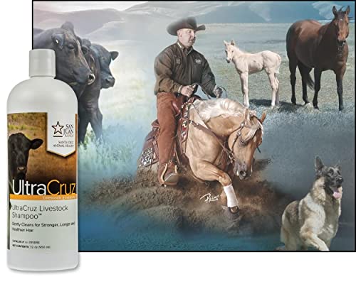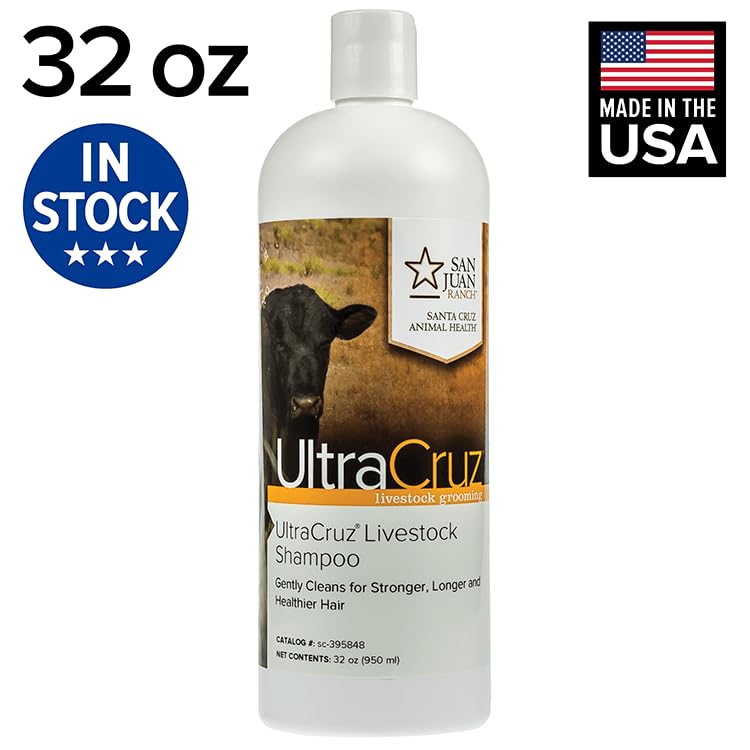 UltraCruz Livestock Shampoo for Cattle, Goats, Sheep and Pigs is a specially formulated shampoo for cattle, sheep, goats and pigs that contains a unique blend of naturally based cleaning agents enriched with proteins, vitamins, moisturizers and emollients. These ingredients work together to thoroughly clean hair without stripping natural oils. This high quality shampoo is lightly scented with Sage, Chamomile and Peppermint, and produces a rich lather to gently but thoroughly remove dirt and debris from the coat for a soft, shiny appearance. UltraCruz Livestock Shampoo for Cattle, Goats, Sheep and Pigs is pH balanced specifically for livestock to provide optimum cleaning and shine without causing irritation or dryness of the skin. This shampoo is therefore safe to use on livestock of all ages. Hydrolyzed Collagen proteins work together with moisturizing agents, Aloe Vera and Vitamin E to restore the natural protein-moisture balance to strengthen the hair and promote a healthy shine.